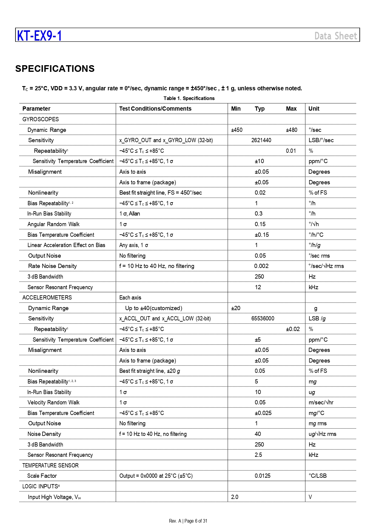Ошибка ортогонального выравнивания ±0,05°, стабильность смещения во время работы 0,3°/час, случайное угловое отклонение 0,15°/ Ö час, нелинейность 0,02%, повторяемость смещения 1°/час, ошибка смещения 20°/час в зависимости от температуры Трехосный цифровой акселерометр, ±20 g и до ±40 g (настраивается) Трехосный выходы угла дельта и скорости Заводская калибровка чувствительности, смещения и осевого выравнивания Диапазон рабочих и калибровочных температур: от -45°C до +85°C Последовательный интерфейс, совместимый с SPI Программируемая работа и управление 4 банка фильтров КИХ, 120 настраиваемых отводов Цифровой вход/выход: индикатор готовности данных, дополнительный внешний тактовый генератор выборки до 3,2 кГц Работа от одного источника питания: от 3,0 В до 3,6 В 1500 g удар (рабочий), удар 10000 g (выживание) ОБЩЕЕ ОПИСАНИЕ Устройство KT-EX9-1 представляет собой полную инерциальную систему, которая включает в себя трехосный гироскоп, трехосный акселерометр. Каждый инерциальный датчик в KT-EX9-1 сочетает в себе передовую в отрасли технологию с обработкой сигнала, которая оптимизирует динамические характеристики. Заводская калибровка характеризует каждый датчик по чувствительности, смещению, выравниванию и линейному ускорению (смещение гироскопа). В результате каждый датчик имеет свои собственные формулы динамической компенсации, которые обеспечивают точные измерения датчика. Инерциальные датчики упакованы в вакуумную керамическую оболочку. Эти меры значительно улучшают шумоакустическую устойчивость продукта . KT-EX9-1 обеспечивает простой и экономичный метод интеграции точного многоосного инерциального зондирования в промышленные системы, особенно по сравнению со сложностью и инвестициями, связанными с дискретными конструкциями. Все необходимые испытания движения и калибровка являются частью производственного процесса на заводе, что значительно сокращает время интеграции системы. KT-EX9-1 упакован в модуль размером приблизительно 47 мм × 44 мм × 14 мм и включает стандартный интерфейс разъема. ПРИМЕНЕНИЕ Стабилизация и управление платформой Навигация Отслеживание персонала Приборы Робототехника